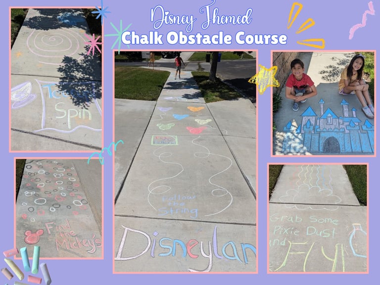 Set up a DIY obstacle course using everyday items like hula hoops, chalk, cones, and pool noodles. Children can challenge each other to complete the course in the shortest time possible. This fun competition encourages imagination, physical fitness and develops agility. We have fun doing themed obstacle courses with chalk, see the Disney themed one below!