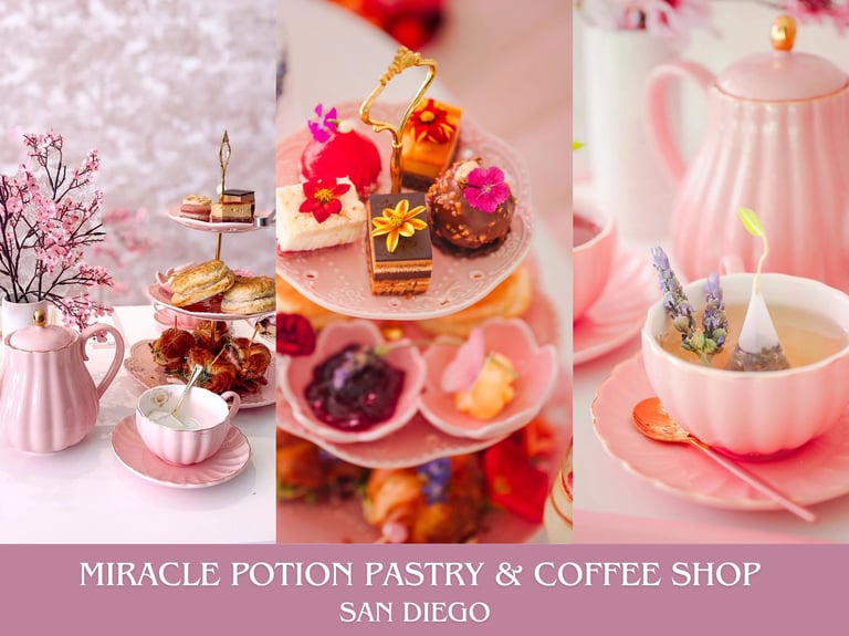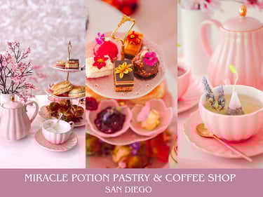 Miracle Potion Pastry & Coffee Shop (San Diego) Award winning, most charming High Tea Experience in San Diego with an adorable pink feminine vibe! Treat yourself to an exquisite Afternoon Tea experience that promises delicious flavors, relaxation, and elegant presentation