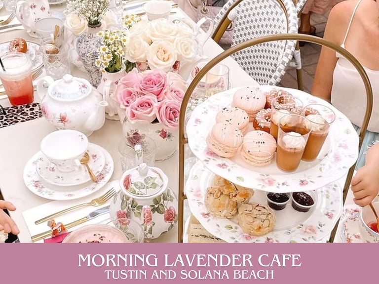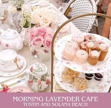 Morning Lavender Cafe (Tustin & Solana Beach)- a modern, feminine take on afternoon tea! They offer a whimsical, fun experience with thoughtful details, curated pastries and delicious finger sandwiches. For families, their delightful “Tea for Tots” experience is a magical treat—featuring a real princess character, enchanting sing-alongs, and story time that captivates young hearts. Little guests enjoy lemonade and lite bites, making it the perfect outing for children ages 2–6 (though all ages are welcome to join in the fun).