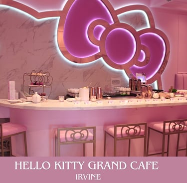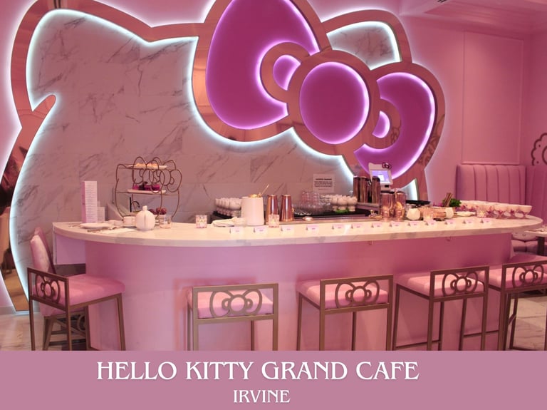 Hello Kitty Grand Cafe (Irvine) Located within the Irvine Spectrum Center. The Hello Kitty Grand Cafe offers a super cute menu featuring freshly baked cookies, cakes, donuts, seasonal goodies, and handmade hot and iced drinks, along with a selection of Hello Kitty Cafe merchandise and a sweet seating area to enjoy the experience.