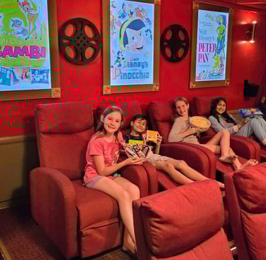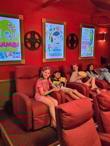 The house even comes with a movie theater and reclining seats. Be sure to pack some popcorn and candy to make an unforgettable family movie night!