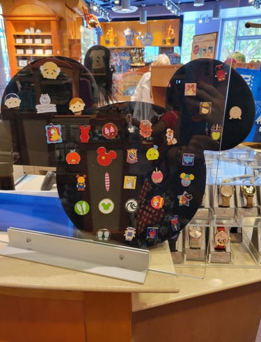 Trading Pins- For us the majority of pin trading comes from the cast members in the park and at almost ANY gift shop. All 3 Disney Hotels offer pin trading at the check in desks as well. If you don't see the pin stand out, you can ask a cast member at the register. Sometimes they have them hidden behind the desk and will bring them out upon request. Here is what the stands look like...