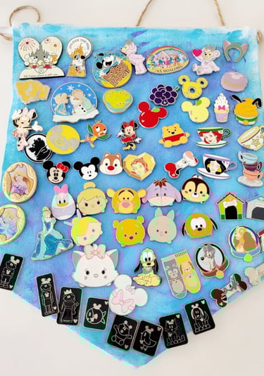 Displaying Pins- With the increasing popularity of pin trading, comes much more options to buy pin displays. We keep it low budget and made our own! We went to the dollar store and bought a canvas banner; Juliet painted it and organized all her pins by categories.
